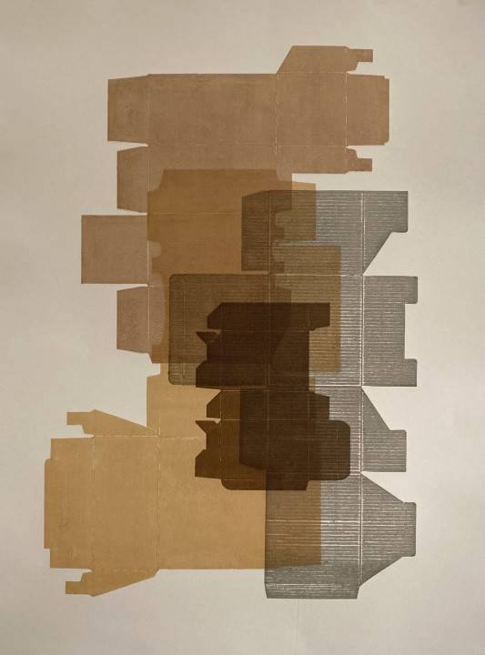 Print from unfolded packaging in ink made with Devon earths on grey Somerset paper 77cm x 56cm