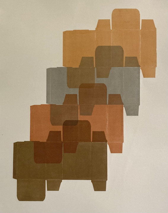Print from unfolded packaging in ink made from Devon earths on grey Somerset paper 77cm x 56cm